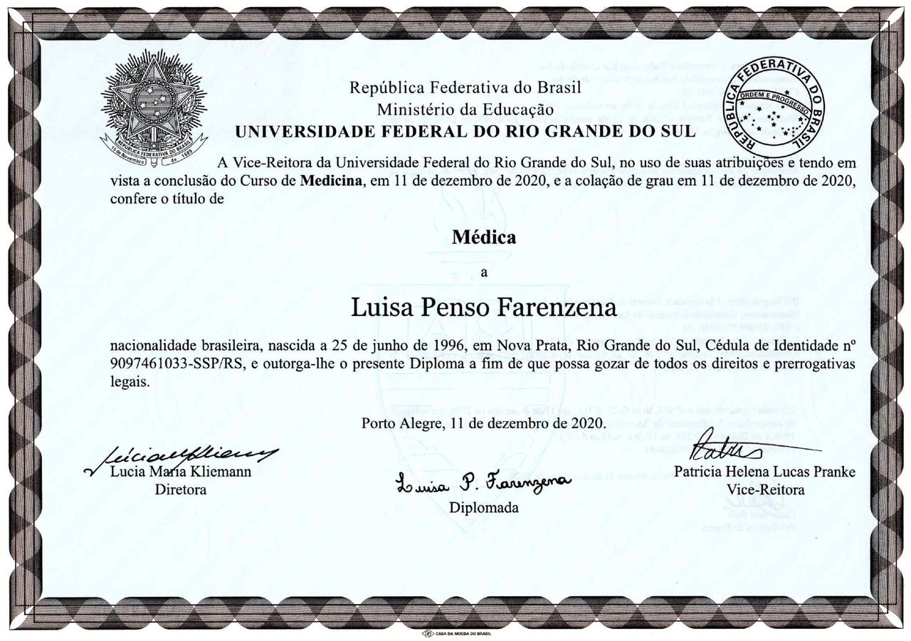 Quando poderia me consultar com Luisa Penso Farenzena?Luisa Penso Farenzena costuma ter horários disponíveis dentro da mesma semana ou para a semana seguinte. Verifique o calendário: você verá o primeiro horário disponível, atualizado em tempo real. Caso o horário sugerido não funcione para você, verifique outras datas. Agendar uma consulta é sempre imediato e gratuito.