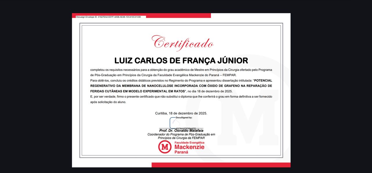 Possuo também mestrado em Princípios de Cirurgia pela Faculdade Evangélica Mackenzie do Paraná (FEMPar), com atuação voltada à pesquisa e ao aprimoramento contínuo na área cirúrgica.