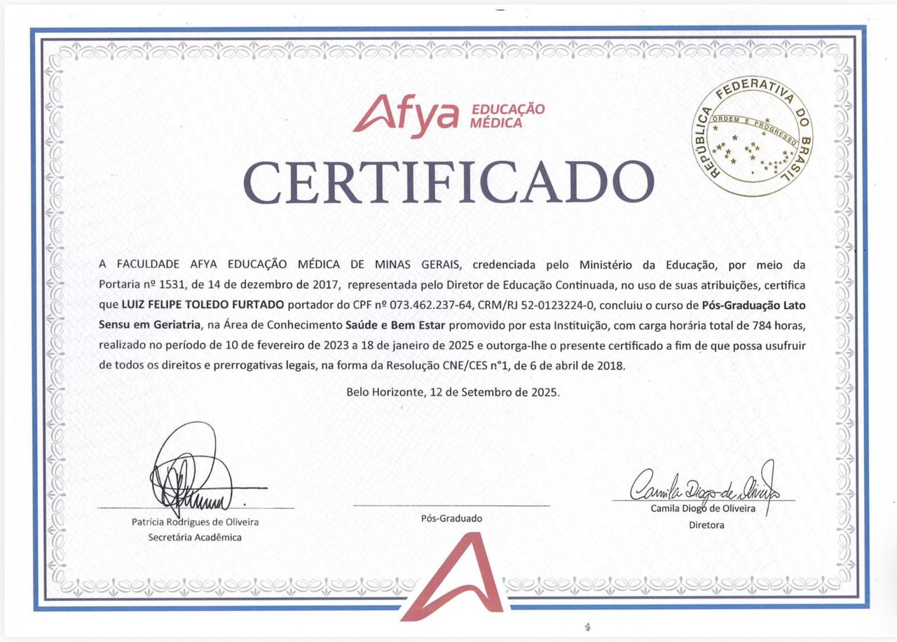 Quais são as principais especialidades de Luiz Felipe Toledo Furtado?Luiz Felipe Toledo Furtado é geriatra. Te mostramos alguns dos serviços oferecidos pelo especialista graças à sua trajetória e vasta experiência: Primeira consulta em geriatria, Laudo médico de avaliação da incapacidade funcional para idosos frágeis, Promoção da saúde, Tratamento para diabetes mellitus tipo 2, Laudo médico para solicitação de medicação de alto custo voltado a saúde do idoso, Consulta domiciliar, Retorno de Exames - Acompanhamento, Osteoporose - diagnóstico e tratamento, Visita Domiciliar em Geriatria e Cuidados Paliativos, Envelhecimento saudável.