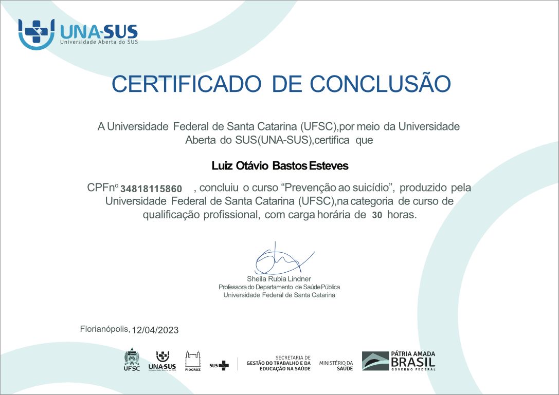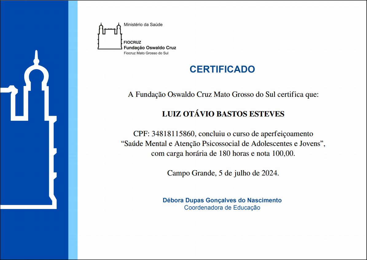 Quais são as principais especialidades de Luiz Otávio Esteves?Luiz Otávio Esteves é psicólogo. Te mostramos alguns dos serviços oferecidos pelo especialista graças à sua trajetória e vasta experiência: Primeira consulta psicologia, Psicoterapia online, Consulta psicológica do idoso, Tratamento da ansiedade, Tratamento da síndrome do pânico, Psicoterapia adulto, Consulta psicológica do adulto, Consulta Psicologia, Tratamento da depressão, Aconselhamento Psicológico.