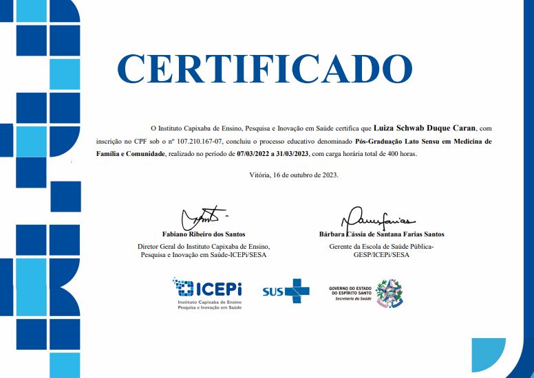 Quais são as principais especialidades de LUIZA SCHWAB DUQUE CARAN?LUIZA SCHWAB DUQUE CARAN é médica de família. Te mostramos alguns dos serviços oferecidos pelo especialista graças à sua trajetória e vasta experiência: Teleconsulta, Teleconsulta medicina de família, Telemedicina Ajuda RS, Primeira consulta Medicina de Família e Comunidade.