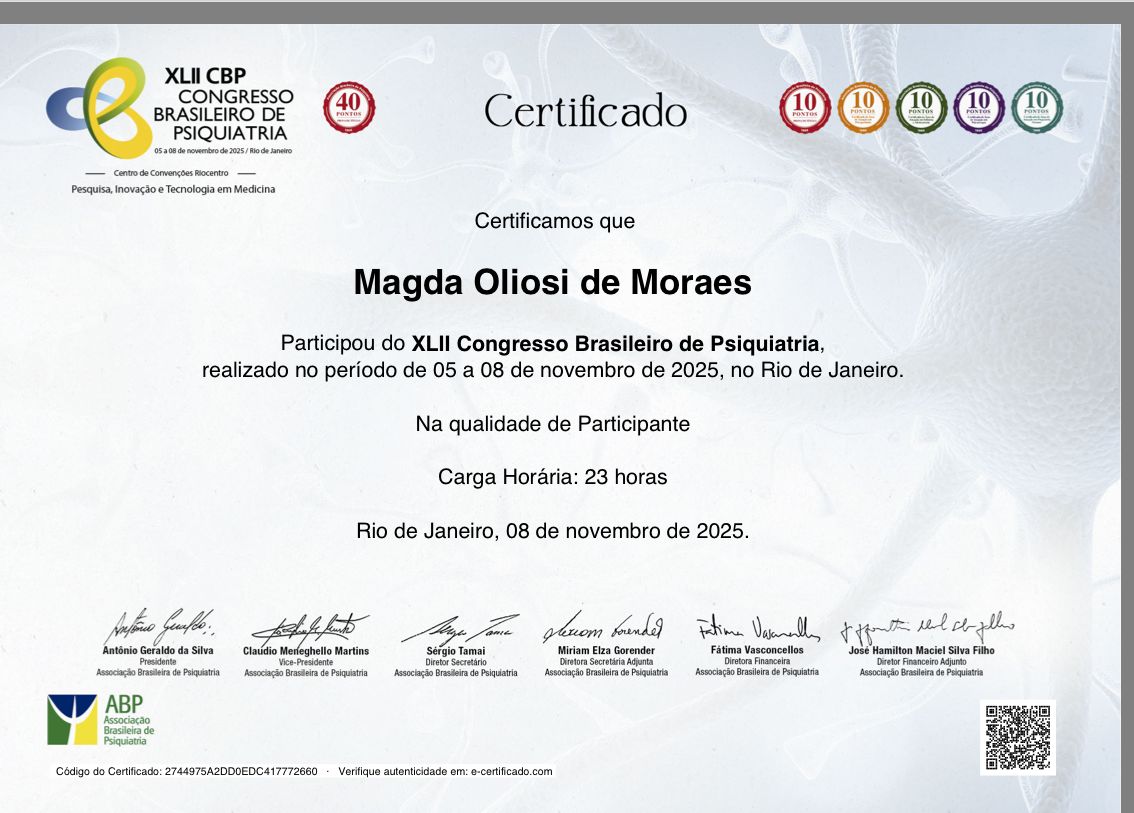 Motivada a seguir este caminho profissional, concluí a Residência Médica em Psiquiatria.