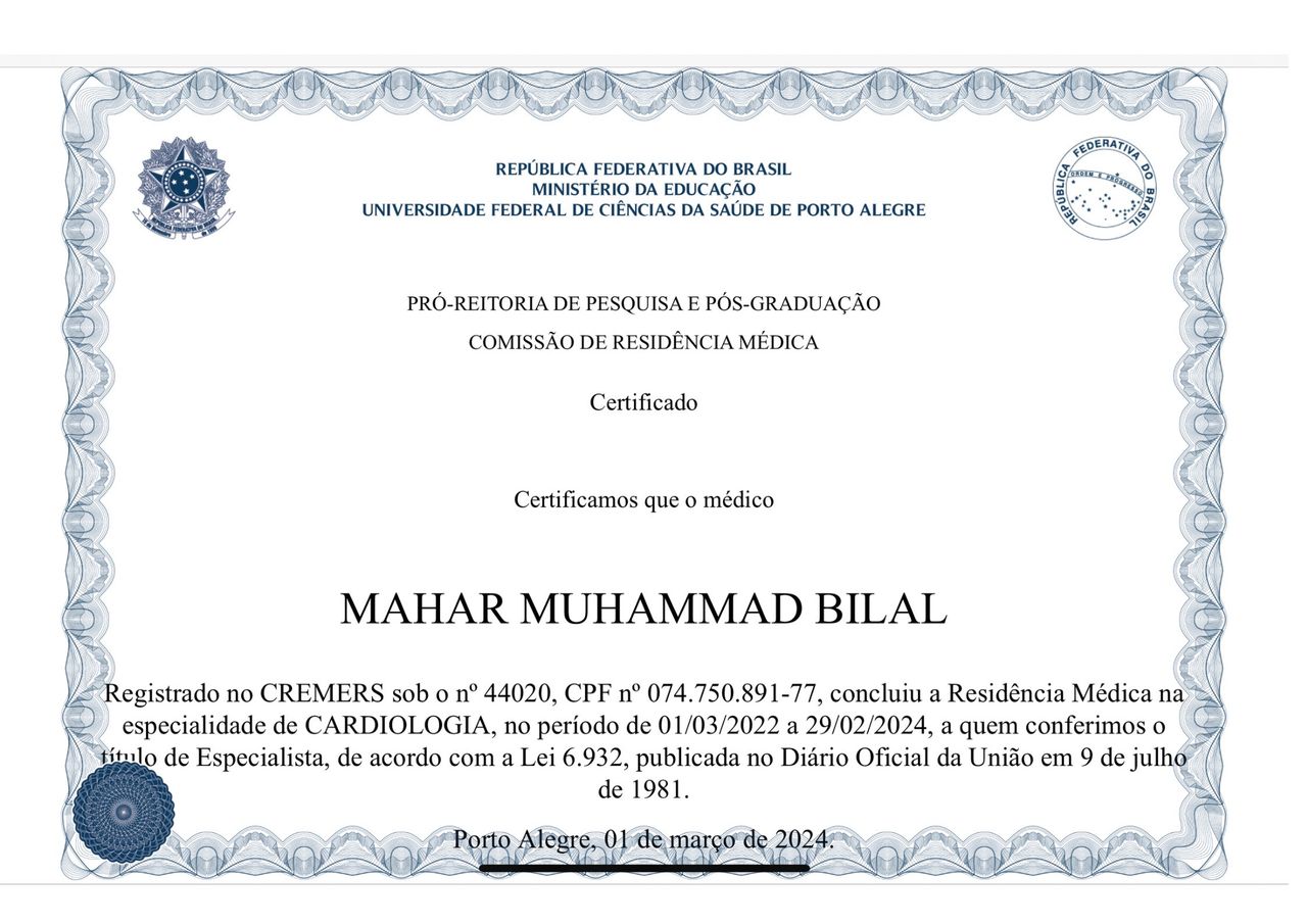 Quais são as principais especialidades de Mahar Muhammad Bilal?Mahar Muhammad Bilal é cardiologista. Te mostramos alguns dos serviços oferecidos pelo especialista graças à sua trajetória e vasta experiência: Primeira consulta clínica médica, Consulta Cardiologia, ECG (eletrocardiograma), Holter 24 horas.