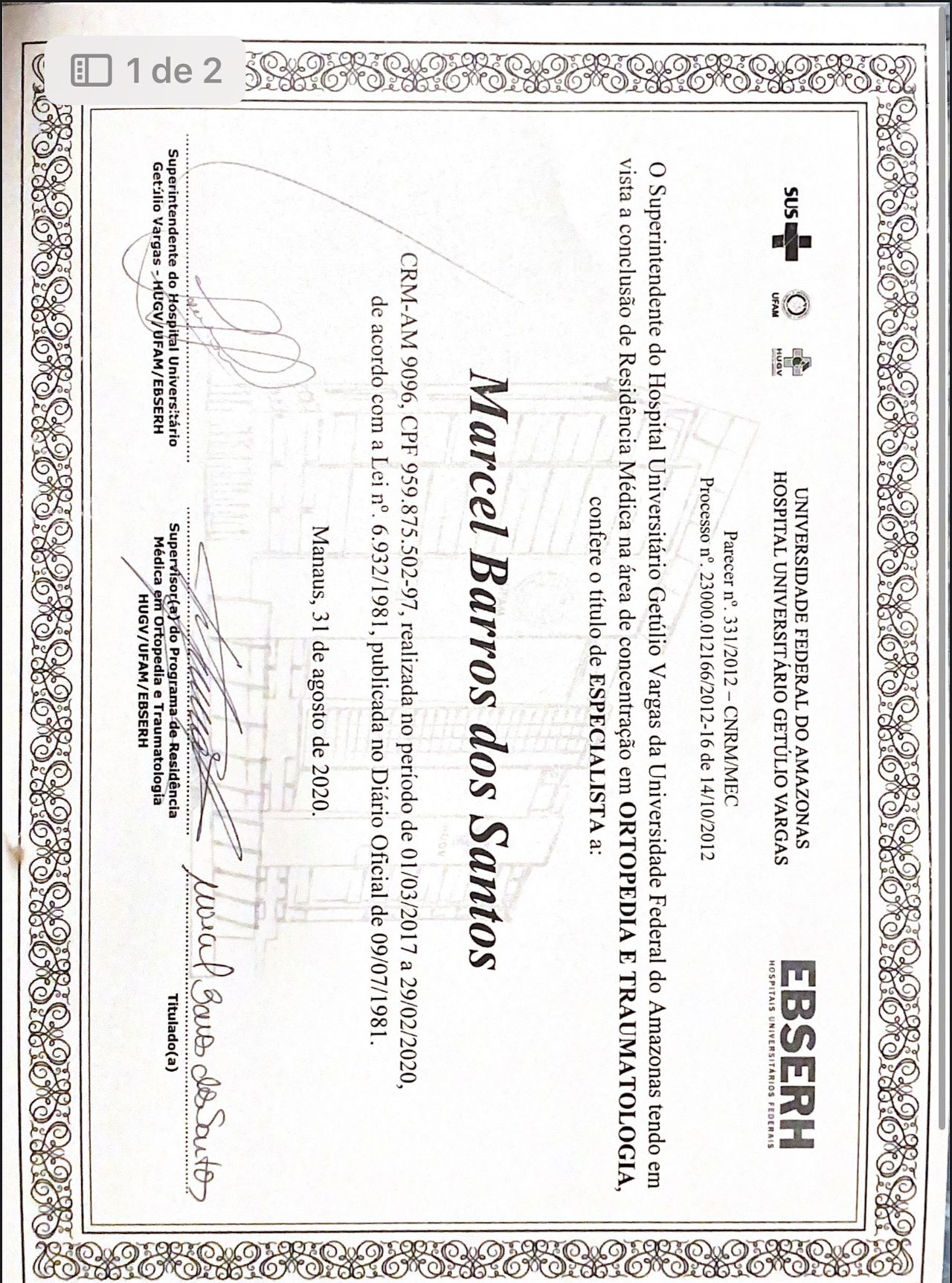 Médico formado pela Universidade Federal do Amazonas - UFAM, com residência médica em Ortopedia e Traumatologia pelo Hospital Universitário Getúlio Vargas - HUGV/UFAM.