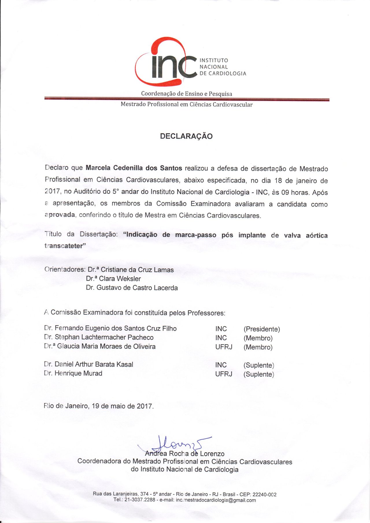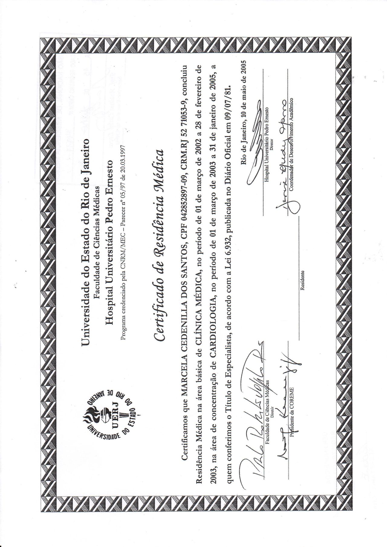 A Dra. Marcela Cedenilla dos Santos é medica cardiologista do Instituto Nacional de Cardiologia há 19 anos, com ampla experiência na prevenção, diagnóstico e tratamento de diversas doenças cardiovasculares. Além disso, é professora de Clinica Medica da Universidade Estácio de Sá e vice-presidente do Departamento de doenças valvares da Sociedade de Cardiologia do Rio de Janeiro(SOCERJ).Muitas palestras em diversos congressos de cardiologia já foram ministradas As consultas incluem a realização do exame de eletrocardiografia(ECG). Além disso, acreditamos que saude não é apenas a ausência de doença e por isso na consulta abordamos aspectos fundamentais para alçançar uma boa saude :alimentação, atividade física, sono reparador, gerenciamento do estresse, saú de mental, suplementação de acordo com a necessidade do paciente, entre outros..Desta forma , o paciente é avaliado de forma integral, humanizada e com foco no tratamento de excelência da sua patologia cardíaca , buscando sempre melhorar o seu bem estar físico e mental.