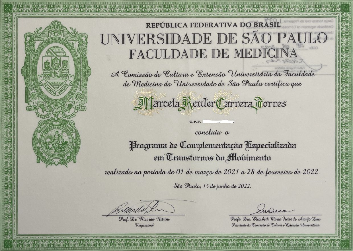 Médica Neurologista pela USP - São Paulo onde fiz especialização em Distúrbios do Movimento (Parkinson, tremor, distonia, coreia, DBS - marca passo cerebral e toxina botulínica);