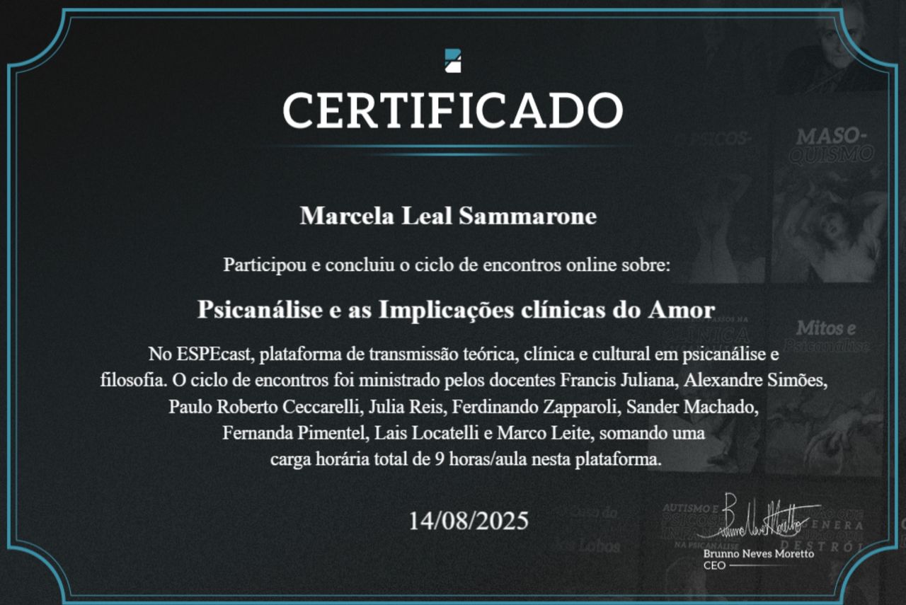 Participo de grupos de estudo, supervisão e aprofundamento em psicanálise e psicologia profunda.