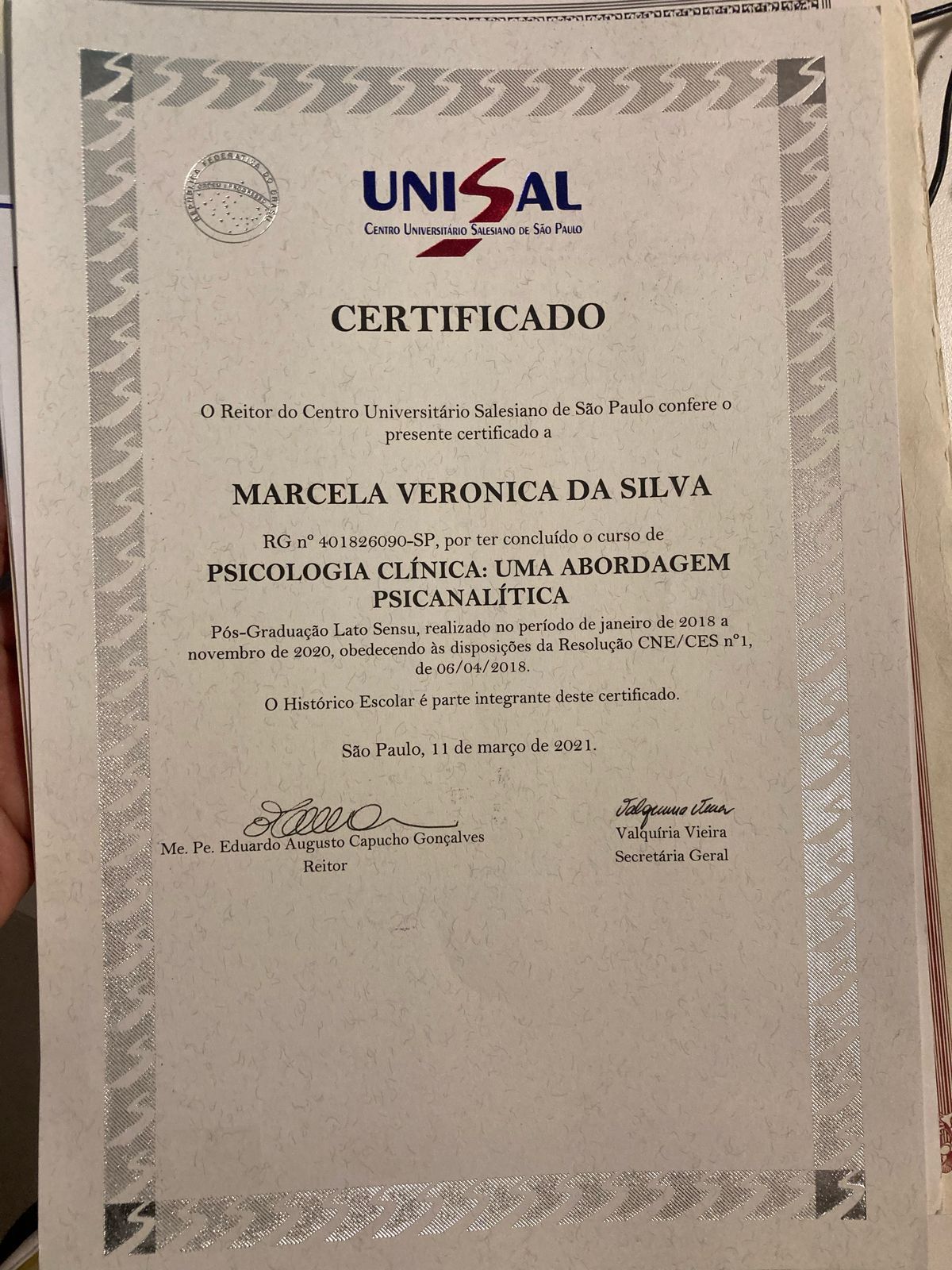 Quais são as principais especialidades de Marcela Verônica da Silva?Marcela Verônica da Silva é psicanalista. Te mostramos alguns dos serviços oferecidos pelo especialista graças à sua trajetória e vasta experiência: Consulta em psicanálise online, Terapia online, Tratamento da ansiedade, Psicoterapia Psicanalítica, Acompanhamento em disforia de gênero, Atendimento a crianças e adolescentes com TEA e TDAH, Atendimento à mulheres no climatério e menopausa, Atendimento à pessoas com pensamentos suicidas, Atendimento de adolescente com pais separados, Atendimento de pessoas LGBTQIA+.