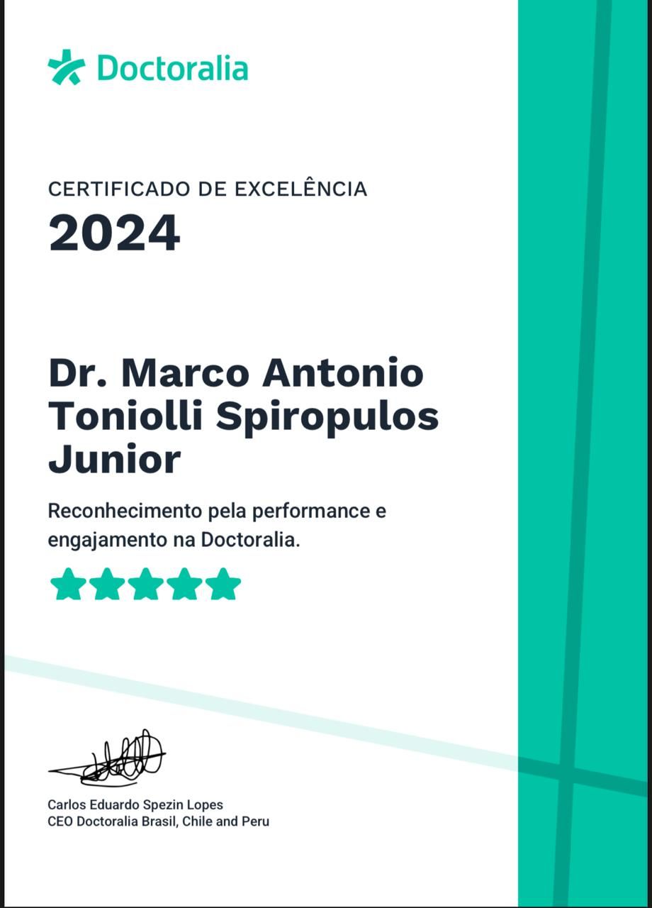 O que outros pacientes opinam sobre Marco Antonio Toniolli Spiropulos Junior?Um total de 104 pacientes já deixou uma opinião honesta e real sobre Marco Antonio Toniolli Spiropulos Junior, que tem uma avaliação média de 5 estrelas (de 5).