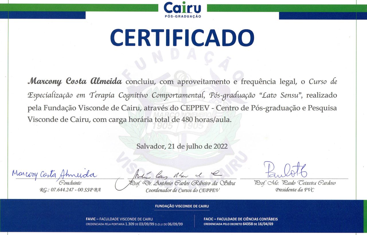 Marcony Costa é psicólogo. Te mostramos alguns dos serviços oferecidos pelo especialista graças à sua trajetória e vasta experiência: Primeira consulta psicologia, Desenvolvimento de controle de emoções, Tratamento para TARE - transtorno alimentar restritivo evitativo, Transtorno de ansiedade social, Tratamento para transtorno de personalidade esquizoide, Educação emocional, Tratamento em transtorno obsessivo compulsivo (TOC), Terapia do esquema, Tratamento da síndrome do pânico, Orientação Vocacional.