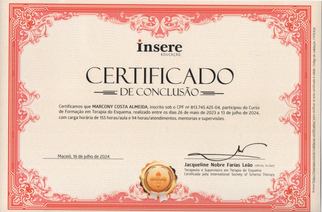Na primeira consulta, conversamos sobre sua queixa inicial e o que o motivou a buscar terapia. A partir desse primeiro encontro, apresento a proposta de acompanhamento terapêutico, fundamentada na Terapia Cognitivo-Comportamental e na Terapia do Esquema, considerando suas necessidades e objetivos no processo terapêutico.