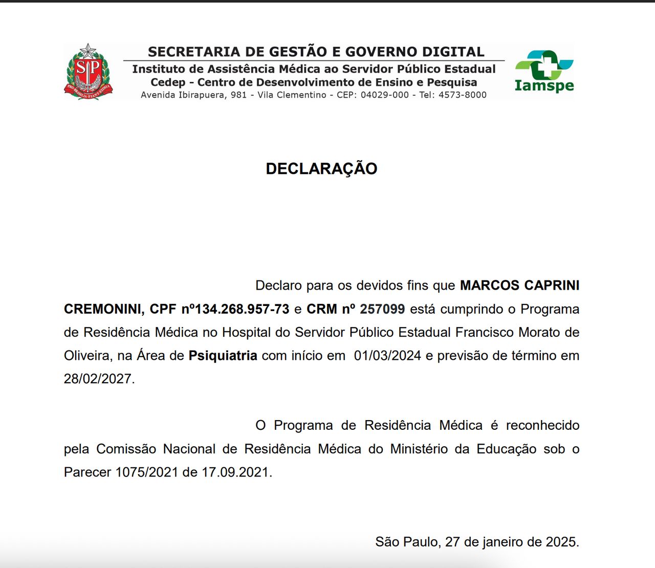Número de registro: CRM:SP 257099 - RQE nao encontrado para (PSIQUIATRA)
