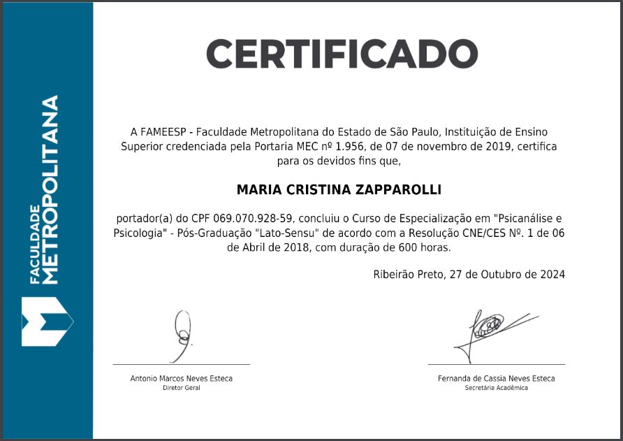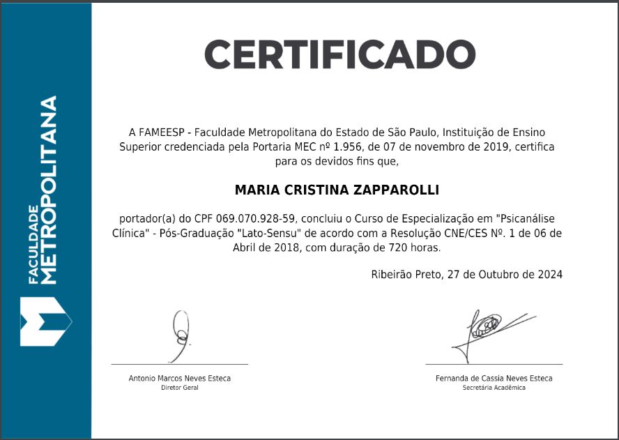 Quais são as principais especialidades de Maria Cristina Zapparolli?Maria Cristina Zapparolli é psicanalista, terapeuta complementar. Te mostramos alguns dos serviços oferecidos pelo especialista graças à sua trajetória e vasta experiência: Teleconsulta, Primeira consulta Psicanalise Online, Terapia de Casal Online, Psicoterapia online, Consulta em psicanálise online, Terapia online, Constelação Sistêmica, Primeira consulta psicanálise, Psicoterapia breve, Consulta Terapias Complementares e Alternativas.