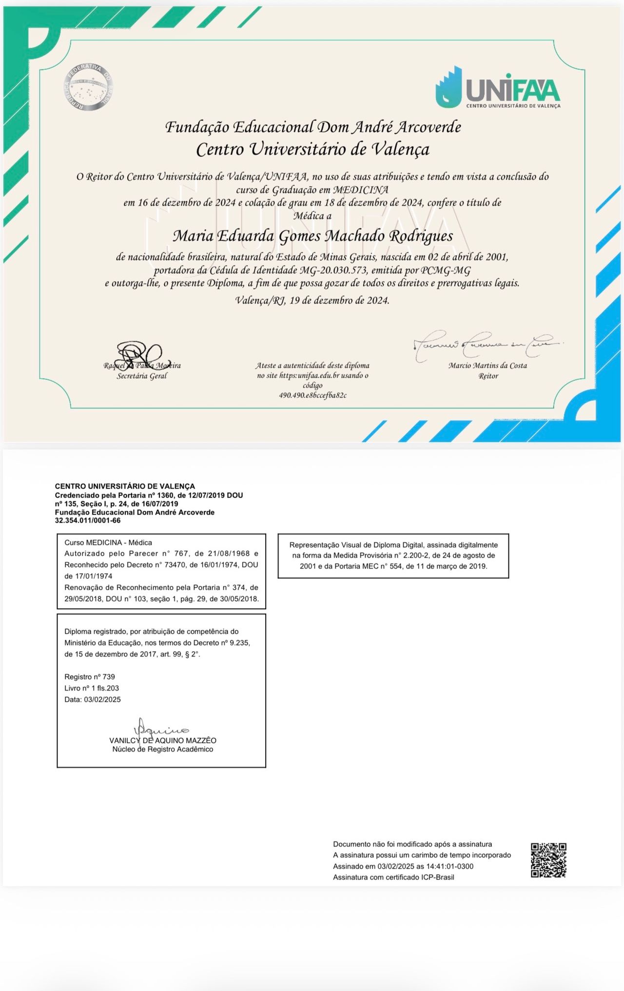 Olá! Sou a Dra. Maria Eduarda Gomes Machado Rodrigues, médica com atuação em saúde mental. Meu trabalho é voltado principalmente para o tratamento da ansiedade, depressão e transtornos alimentares, sempre com uma abordagem individualizada, baseada em evidências científicas e no cuidado humano.