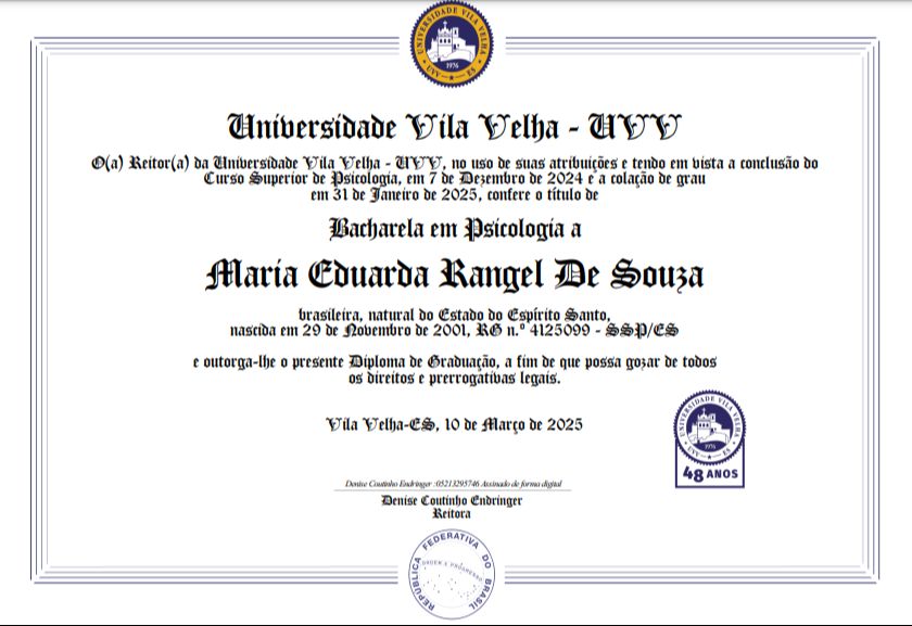 Quais são as principais especialidades de Maria Eduarda Rangel de Souza?Maria Eduarda Rangel de Souza é psicóloga. Te mostramos alguns dos serviços oferecidos pelo especialista graças à sua trajetória e vasta experiência: Primeira consulta psicanálise, Atendimento em Psicologia, Teleconsulta.
