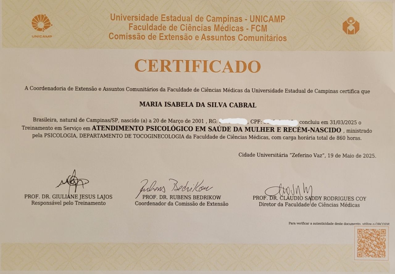 Em 2024 realizei Treinamento em Serviço Saúde da Mulher (Oncologia) no CAISM/Unicamp, onde tive uma experiência rica em hospital de Alta Complexidade.