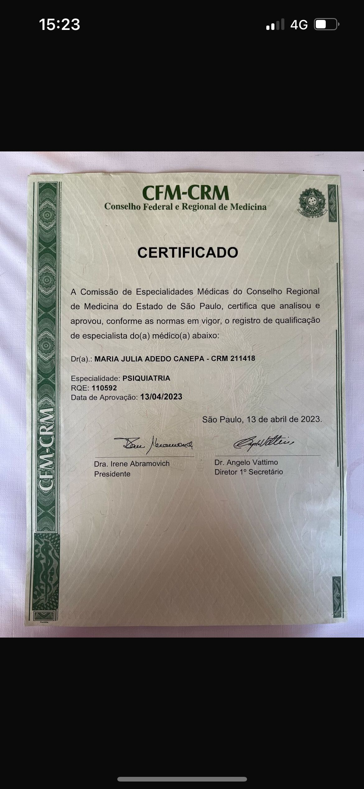 Quais são as principais especialidades de Maria Júlia Adedo Canepa?Maria Júlia Adedo Canepa é psiquiatra. Te mostramos alguns dos serviços oferecidos pelo especialista graças à sua trajetória e vasta experiência: Teleconsulta, Tratamento da ansiedade, Tratamento da depressão, Acompanhamento de pessoas transgêneras, Acompanhamento de transtorno do espectro autista (TEA), Acompanhamento de pacientes adultos, Primeira consulta Psiquiatria.