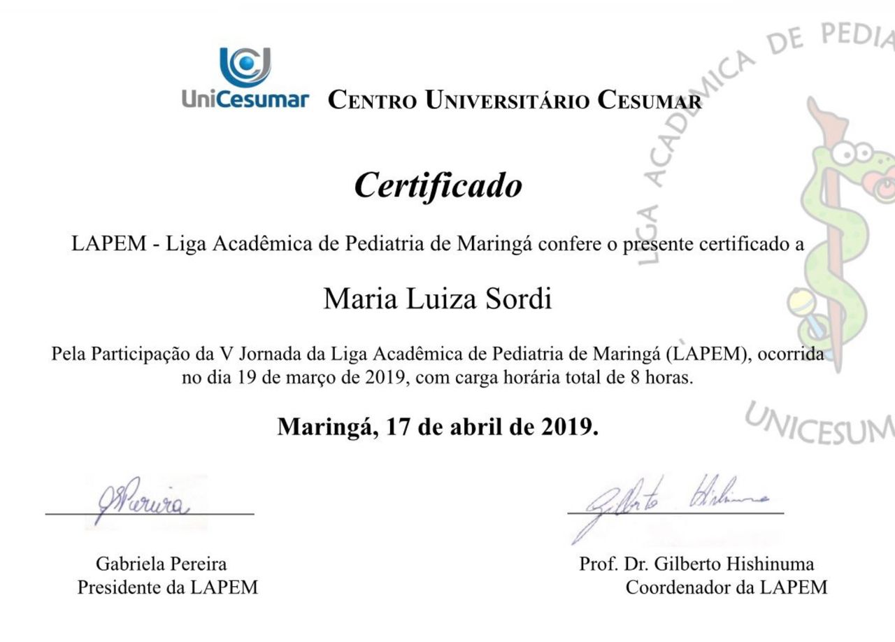 Como posso marcar uma consulta com Maria Luiza Sordi?O calendário que Maria Luiza Sordi exibe em seu perfil na Doctoralia é atualizado em tempo real. Tudo o que precisa é escolher o dia e a hora que forem mais convenientes para você. O agendamento é gratuito e você também recebe um lembrete antes da consulta.