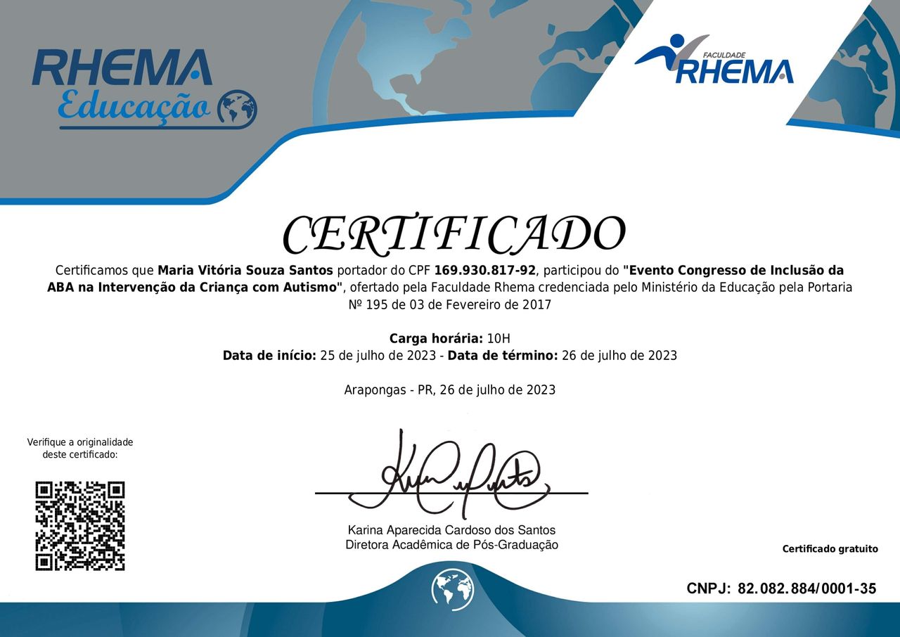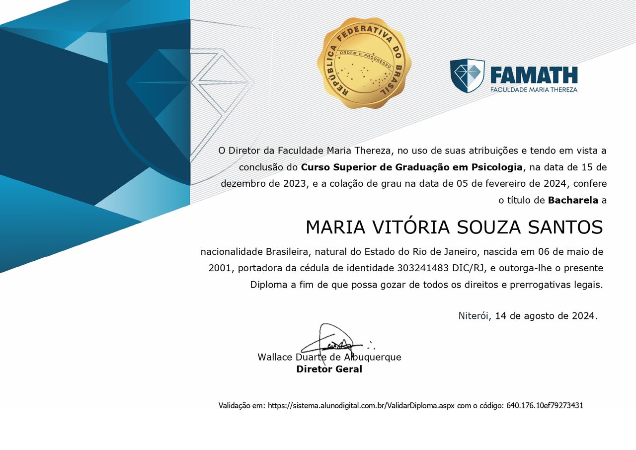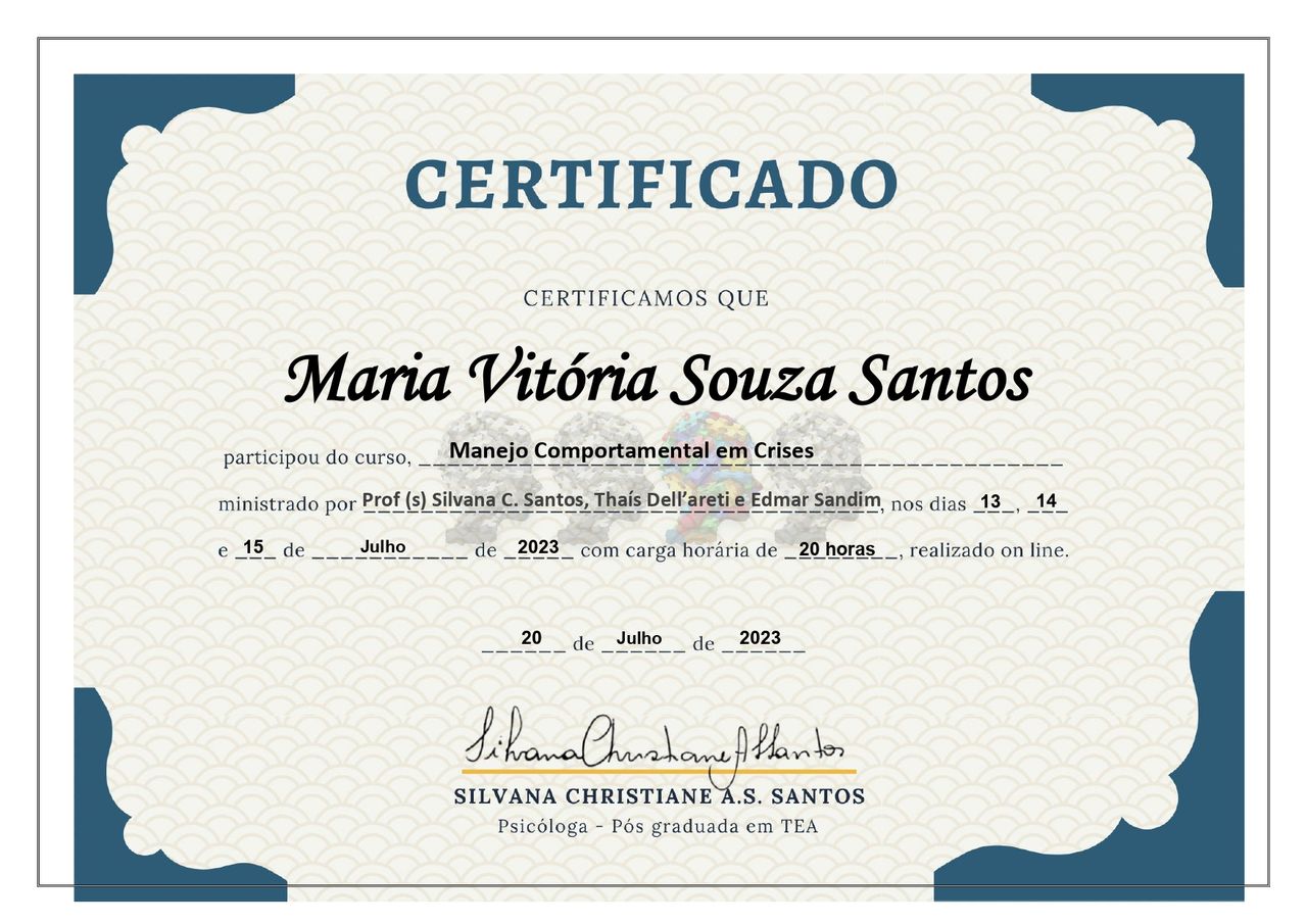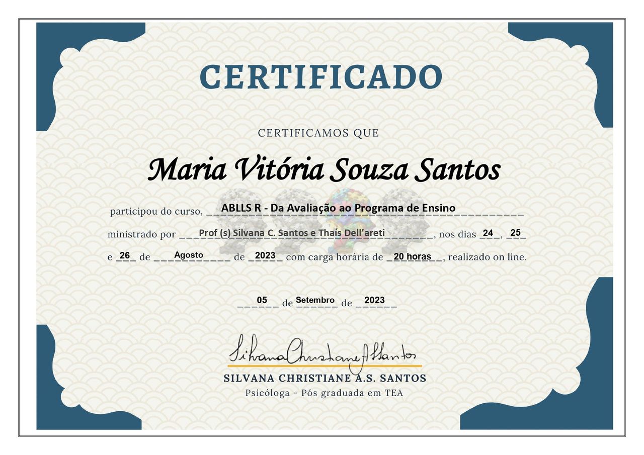 Quais são as principais especialidades de Maria Vitória Souza Santos?Maria Vitória Souza Santos é psicóloga. Te mostramos alguns dos serviços oferecidos pelo especialista graças à sua trajetória e vasta experiência: Atendimento psicológico, Atendimento para TEA e TDAH (infantil).