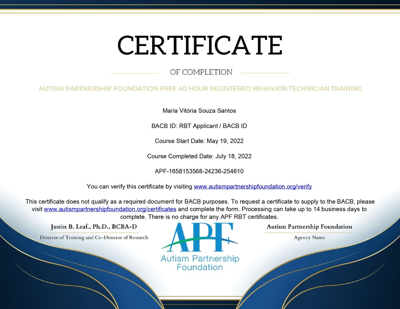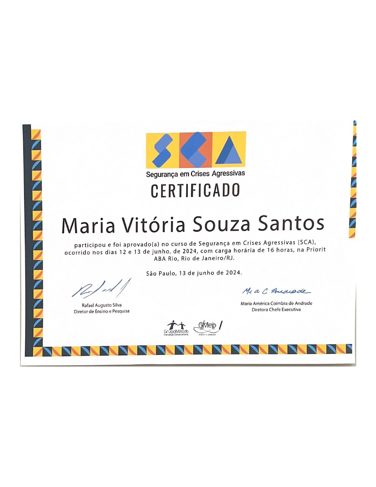 Psicóloga com especialização em Análise do Comportamento Aplicado ao Autismo, Atrasos de Desenvolvimento Intelectual e de Linguagem, Introduction To Pivotal Response Treatment Level 1 e Avaliação Neuropsicológica.