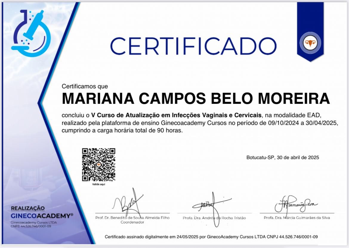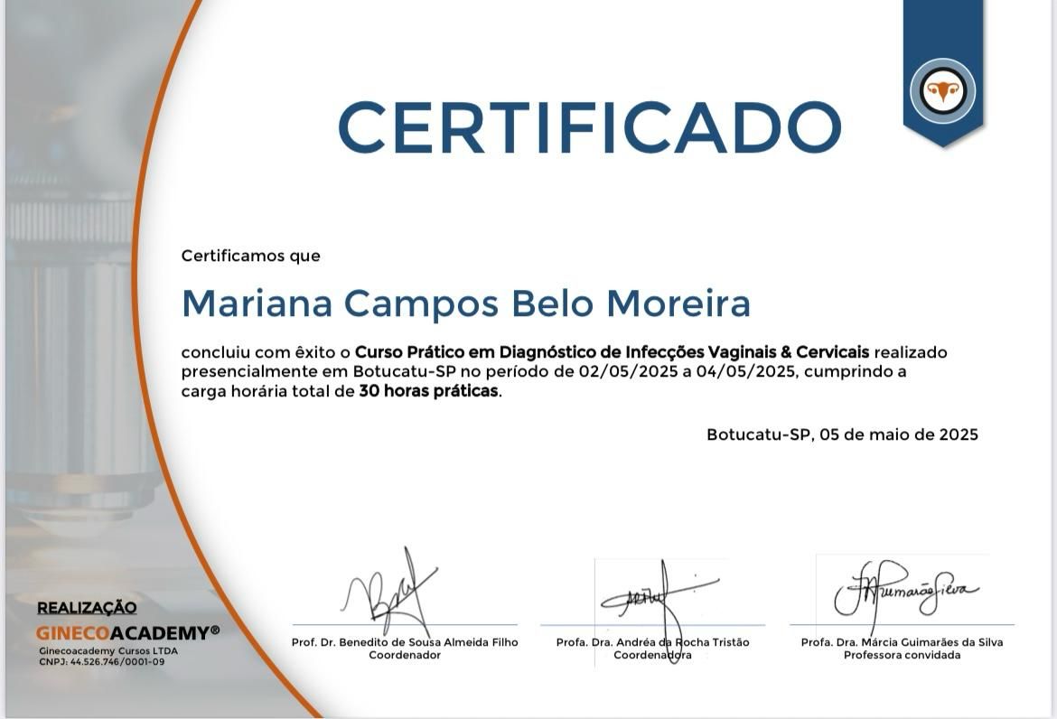 Profissional muito atenciosa, cuidadosa e acolhedora em todas as etapas do atendimento. Demonstra profundo conhecimento técnico e transmite segurança ao explicar cada detalhe com clareza e paciência. Sua postura humanizada faz toda a diferença durante a consulta, proporcionando tranquilidade e confiança. Recomendo fortemente o trabalho da Dra. Mariana, pela competência, dedicação e excelência no cuidado à saúde da mulher.