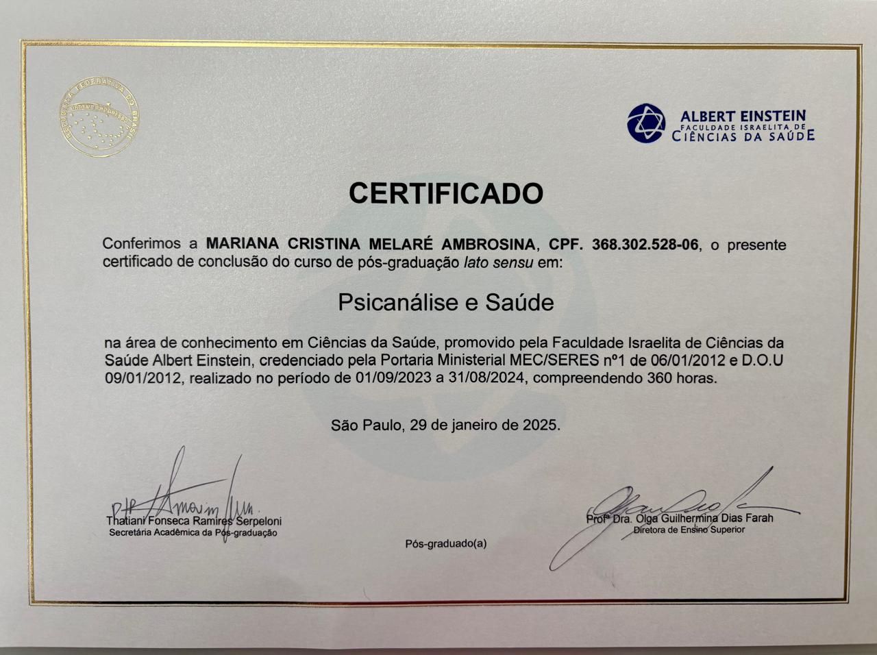 Formada em Psicologia pela UNIFESP (2012), com especialização em Psicologia Hospitalar pelo Hospital das Clínicas da Faculdade de Medicina da USP-SP. Formação em Psicanálise pelo Sedes Sapientiae, em São Paulo. Pós-graduada em Gestão em Saúde pela Fiocruz e em Psicanálise e Saúde pelo Hospital Israelita Albert Einstein.