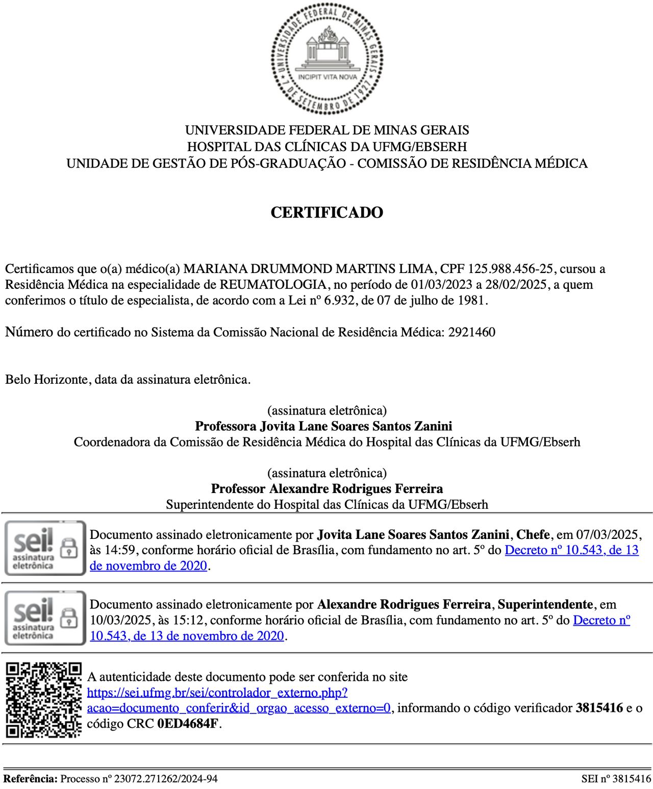 Realizou Residência em Clínica Médica na Escola Paulista de Medicina da Universidade Federal de São Paulo (Unifesp) e, posteriormente, Residência em Reumatologia na UFMG. Toda sua formação foi realizada em hospitais universitários de referência nacional, adquirindo sólida formação clínica e ampla experiência no manejo de doenças reumatológicas complexas.