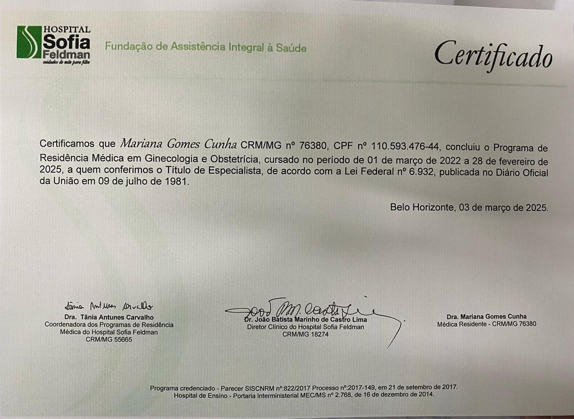 Guiada por esse desejo, iniciei minha residência médica em Ginecologia e Obstetrícia no Hospital Sofia Feldman, a maior maternidade do Brasil, instituição que admiro profundamente e onde tenho a honra de fazer parte do corpo clínico. Essa casa me ensinou valores que carrego para a minha prática: respeito à mulher, importância da equipe multidisciplinar e a necessidade de atualização e práticas baseadas em evidências científicas.