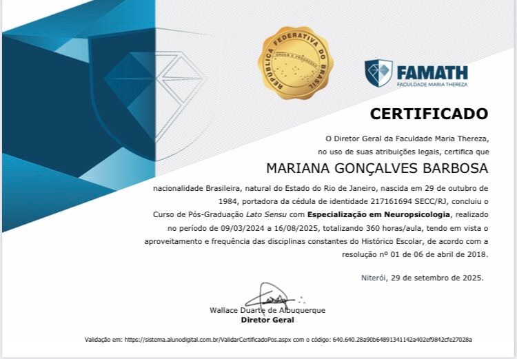 Sou psicóloga clínica, com especialização em Neuropsicologia, Análise do Comportamento e Análise do Comportamento Aplicada (ABA). Atuo em consultório particular em Icaraí, Niterói/RJ.