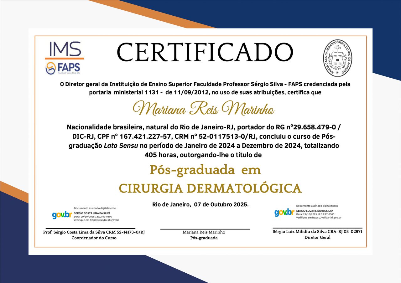 Minha especialização em Dermatologia Clínica, Estética e Cirúrgica me permite olhar para cada paciente de forma integral, oferecendo tratamentos personalizados que respeitam a individualidade e realçam a beleza natural.