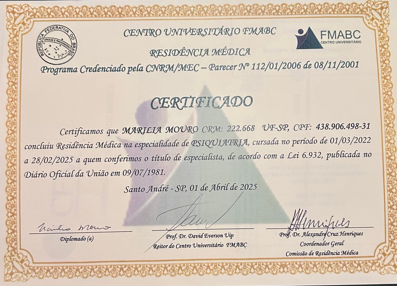 Além disso, a Dra. Marília possui registro de especialidade médica em Psiquiatria, o que reforça sua credibilidade e competência na área.