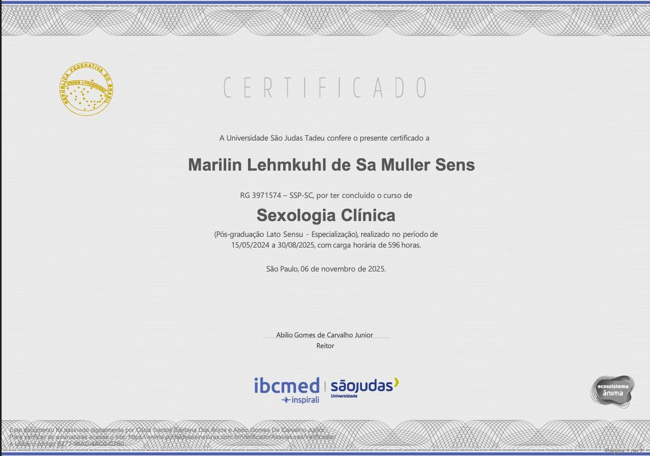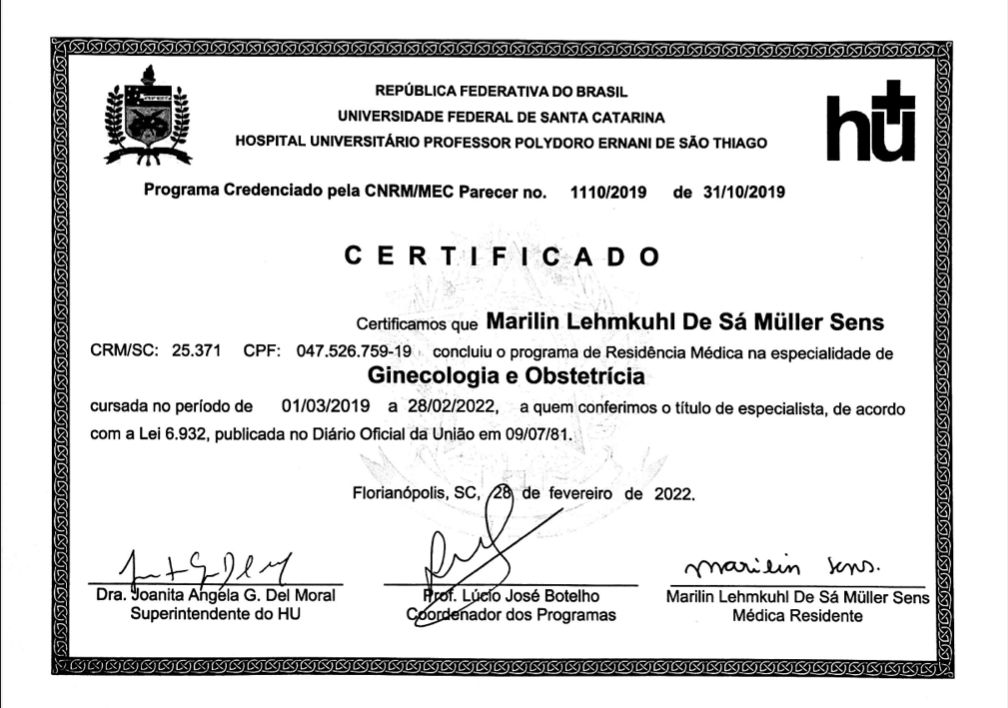 Sou pós-graduada em Ultrassonografia Ginecológica e em Sexologia, além de membro concursada do Corpo Clínico de Ginecologia da UFSC (Ebserh/HU-UFSC).
