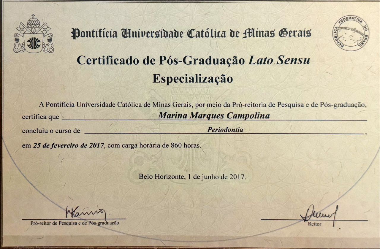 Quais são as principais especialidades de Marina Campolina?Marina Campolina é dentista. Te mostramos alguns dos serviços oferecidos pelo especialista graças à sua trajetória e vasta experiência: Primeira consulta Odontológica, Microcirurgia periodontal, Cirurgia periodontal a retalho, Clareamento dental, Restauração dental, Orientação profissional, Aumento de coroa clínica, ATM bruxismo (articulação temporomandibular), Consulta periodontia, Gengivoplastia.