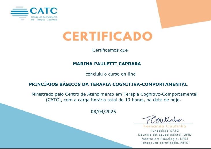 Quais são as principais especialidades de Marina Caprara?Marina Caprara é psicóloga. Te mostramos alguns dos serviços oferecidos pelo especialista graças à sua trajetória e vasta experiência: Teleconsulta, Primeira consulta psicologia, Psicoterapia breve, Tratamento da síndrome do pânico, Consulta psicológica do idoso, Consulta psicológica do adulto, Consulta de psicologia online, Psicoterapia, Consulta psicológica do adolescente, Transtorno de déficit de atenção e hiperatividade - TDAH.