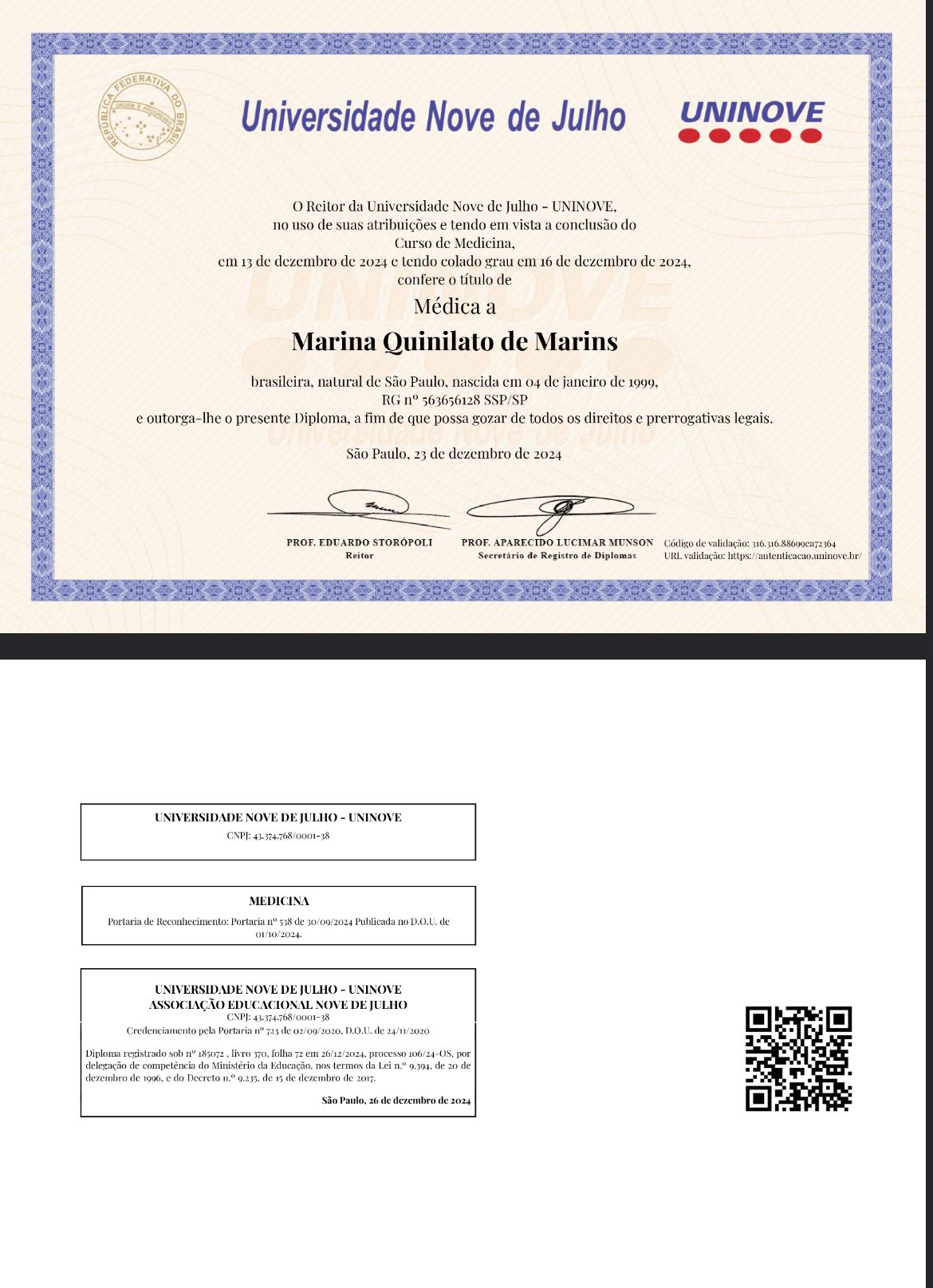 Olá, me chamo Marina Quinilato de Marins, sou médica formada pela Universidade Nove de Julho, com atuação em Clínica Médica e em Medicina Estética e Rejuvenescimento. Atualmente, sou pós-graduanda em Medicina Estética pelo Instituto Lapidare, mantendo constante atualização científica e técnica para oferecer tratamentos seguros e eficazes.
