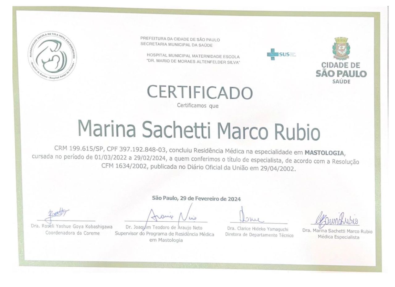 Quais são as principais especialidades de Marina Sachetti Marco Rubio?Marina Sachetti Marco Rubio é mastologista, ginecologista. Te mostramos alguns dos serviços oferecidos pelo especialista graças à sua trajetória e vasta experiência: Primeira consulta Mastologia, Consulta mastologia, Assessoramento em Aleitamento Materno, Extirpacao De Tumor Ou Adenoma Da Mama, Retorno de consultas Mastologia, Encaixe Telemedicina, Exame ginecológico, Extirpacao De Mama Supranumeraria, Incisao E Drenagem De Abscesso Da Mama, Setorectomia Com Esvaziamento Ganglionar.