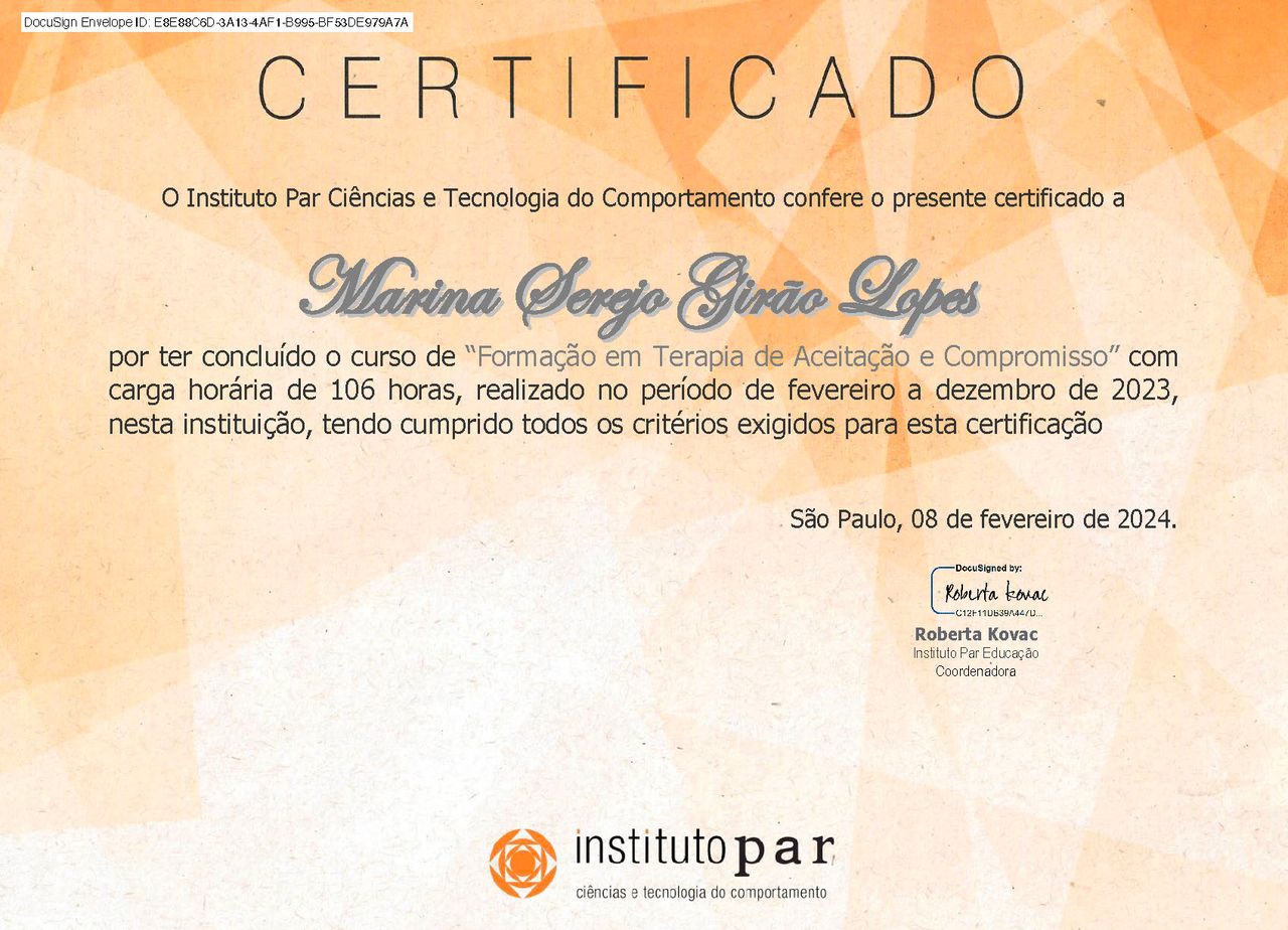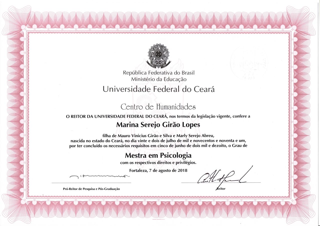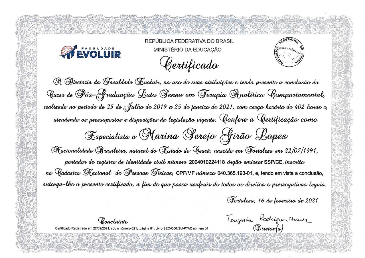 Sou Marina Serejo Girão Lopes, Psicóloga graduada pela Universidade Federal do Ceará, mestre em psicologia e especialista em Neuropsicologia e em Terapia Analítico-Comportamental, além de ter diversos cursos na área clínica. Minha abordagem é a Análise do Comportamento, também conhecida como Terapia Analítico-Comportamental (TAC). Também trabalho com a Terapia de Aceitação e Compromisso (ACT) e a Terapia Analítico-Funcional (FAP), que são terapias comportamentais de terceira geração, (terapias comportamentais contextuais).