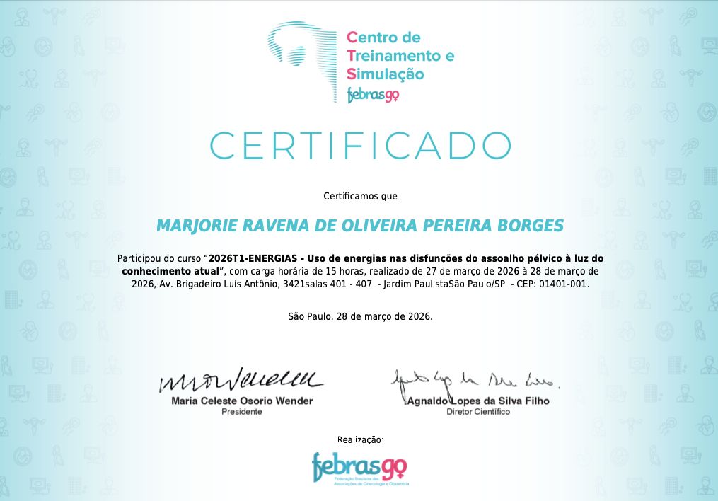Quais são as principais especialidades de Marjorie Borges?Marjorie Borges é ginecologista. Te mostramos alguns dos serviços oferecidos pelo especialista graças à sua trajetória e vasta experiência: Primeira consulta ginecologia e obstetrícia, Laserterapia, Primeira consulta ginecologia, Tratamento da síndrome dos ovários policísticos, Reposição hormonal feminina, Consulta particular, Inserção do DIU de cobre, DIU mirena, Encaixe Telemedicina, Exame de Papanicolaou.