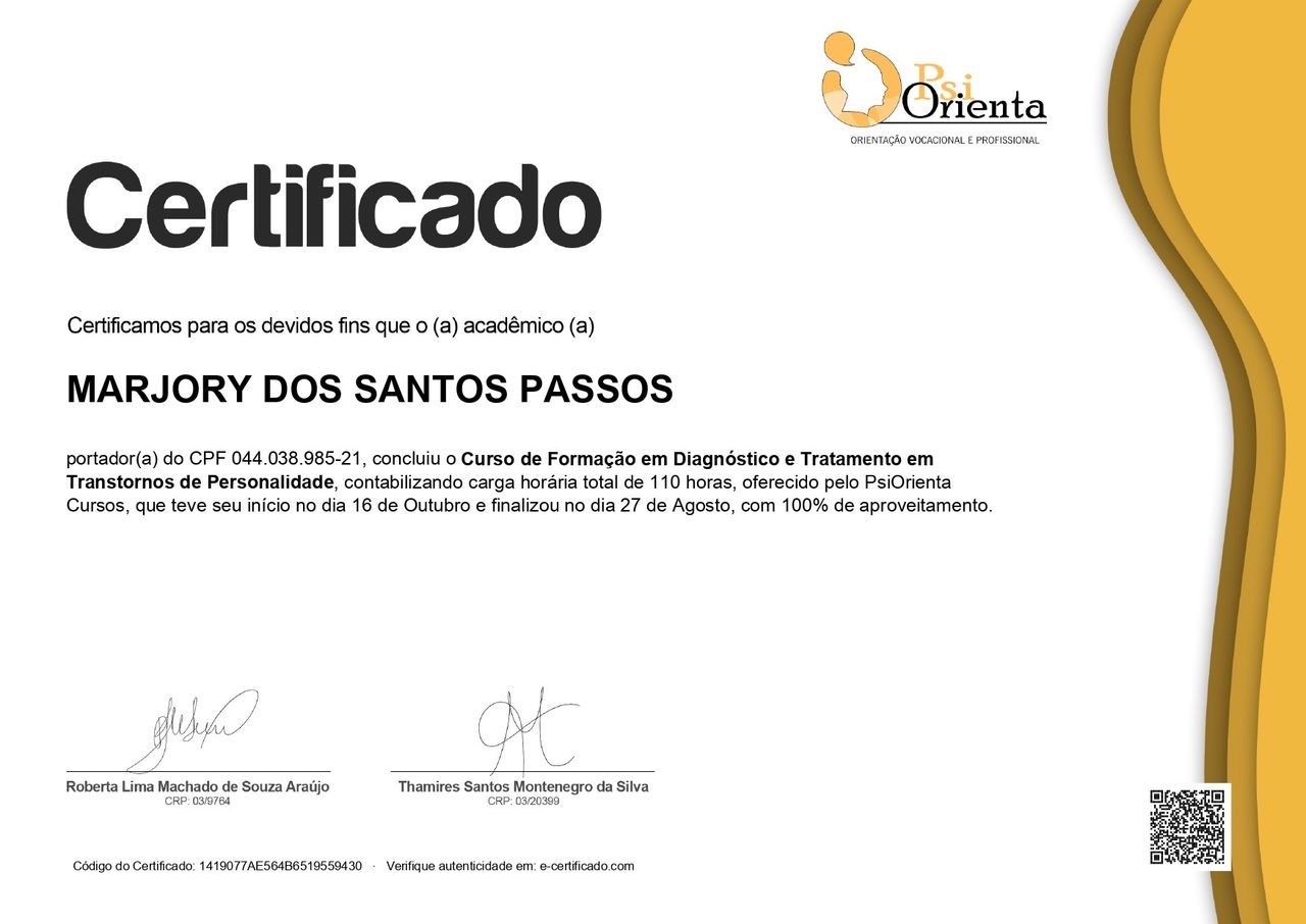 Meu nome é Marjory Passos, sou psicóloga clínica há 8 anos, especialista em Avaliação Psicológica e Mestre em Saúde. Atendo presencialmente em Feira de Santana e online para todo o Brasil e exterior.