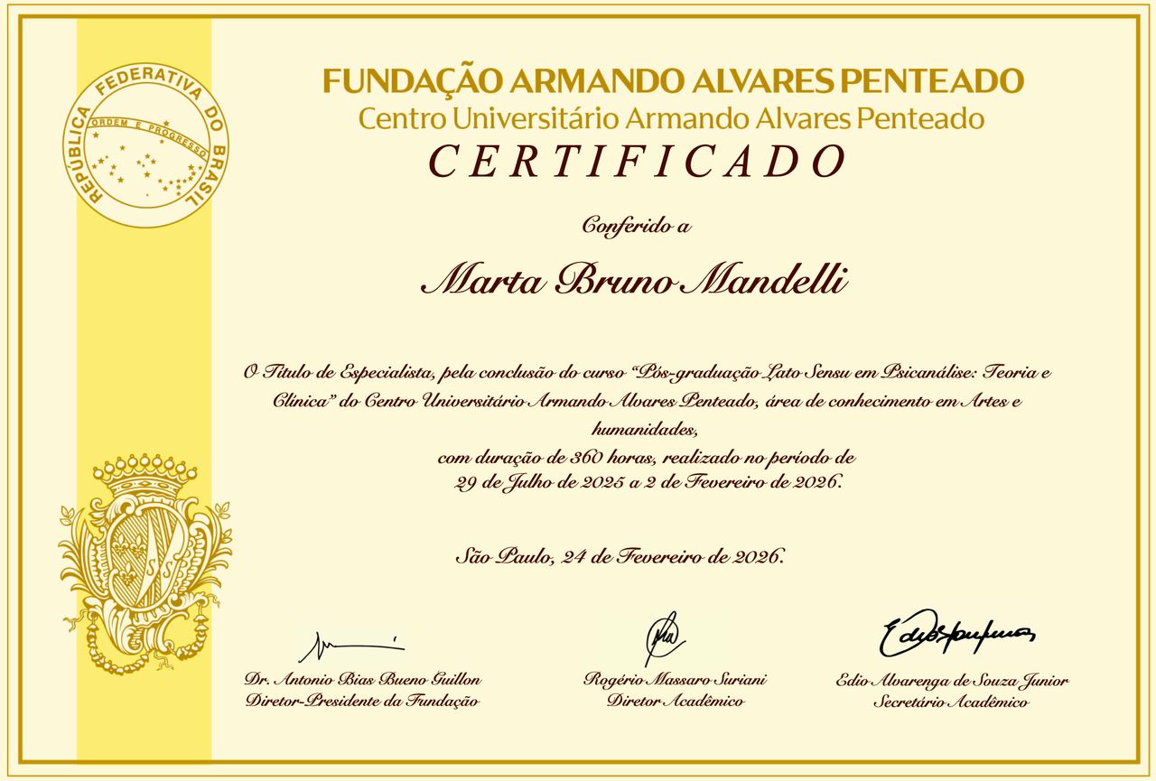 Psicóloga há quase 20 anos, psicanalista pela FAAP, pós-graduada em Psicologia Clínica pela PUC-RS, atualização em Transtorno Ansioso e Depressivo pelo Instituto Albert Einstein, Psicossomática pela Artmed Academy, Anxiety and Stress Disorders pela Harvard Medical School e discente no CEP (Centro de Estudos Psicanalíticos).