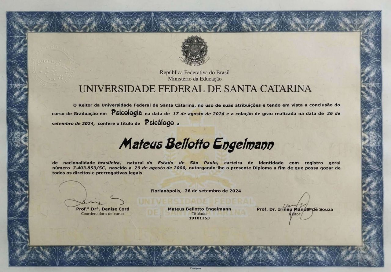Me chamo Mateus e sou psicólogo formado pela UFSC, tendo experiência principal com a Terapia Cognitiva Comportamental, a qual entende que muitas vezes vivemos em padrões de pensamentos negativos, que nos impedem de agirmos da forma mais positiva conosco e nas nossas relações, sendo o papel da terapia ajudar na reflexão sobre esses padrões e desenvolver formas mais produtivas de nos relacionar com os nossos problemas