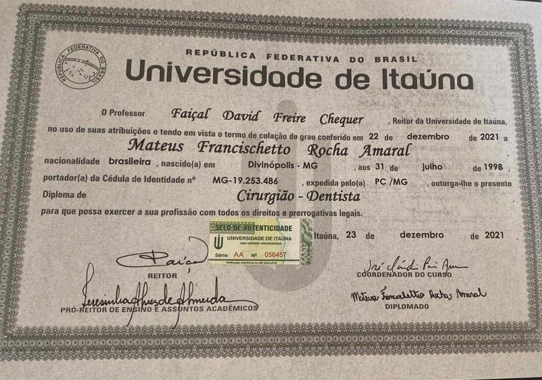 Graduado em odontologia pela Universidade de Itaúna (2021), pós graduação em cirurgia oral menor pela ABO - Divinópolis (2022).