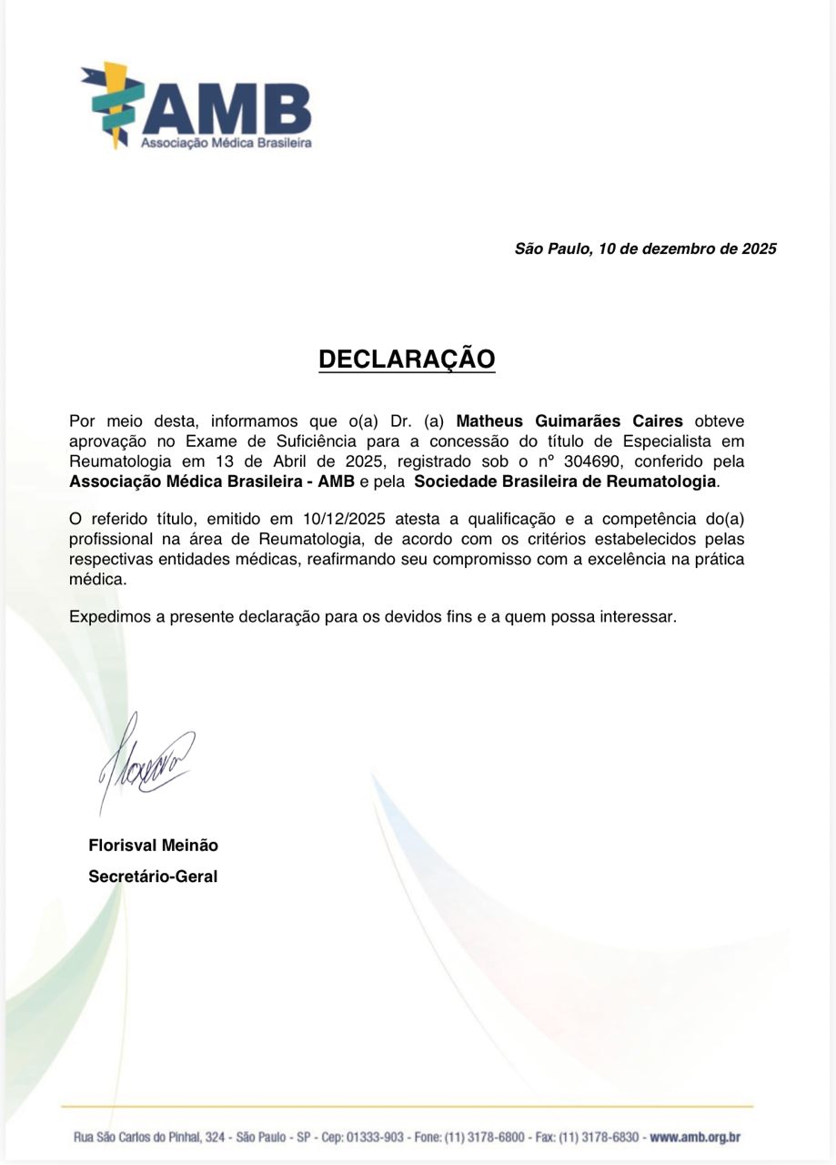 Dr Matheus é um reumatologista de extrema competência, atualizado e tecnicamente seguro. Demonstra rigor diagnóstico, clareza nas condutas e cuidado genuíno com seus pacientes. Profissional ético, acessível e comprometido com a Medicina baseada em evidências. Recomendo com plena confiança.