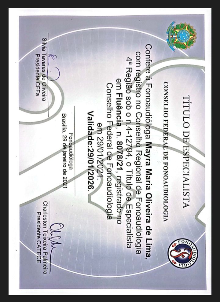 Especialista em Fluência, Mestre e Doutoranda em Saúde da Comunicação Humana.