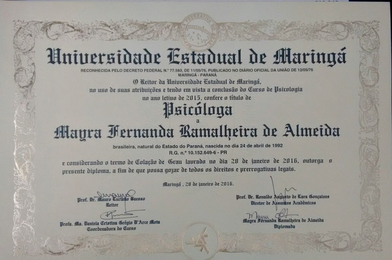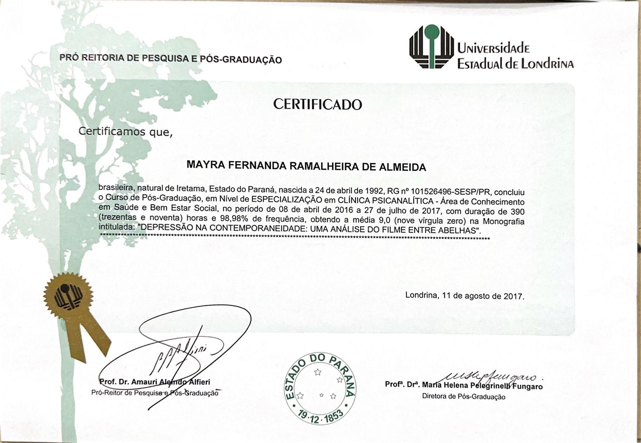 Sou psicóloga formada pela Universidade Estadual de Maringá (UEM), especialista em Clínica psicanalítica pela Universidade Estadual de Londrina (UEL) e em um percurso em Psicanálise. Realizo atendimentos presenciais em Maringá (PR) com crianças, adolescentes, adultos e casais.