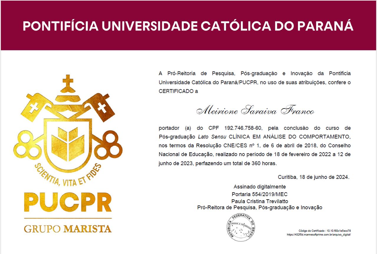 Pós Graduada em Psicologia Clínica em Análise do Comportamento, PUCPR.
