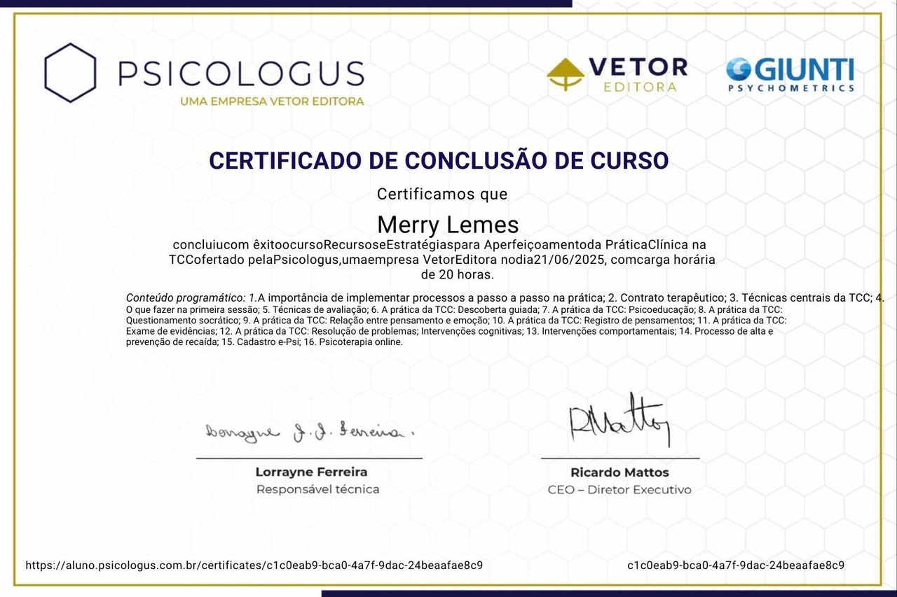 É imensurável a ajuda que a Merry me prestou hoje. Profissional muito competente, com vasto conhecimento. Recomendo fortemente uma consulta, o preço da consulta é justo e vale realmente a pena