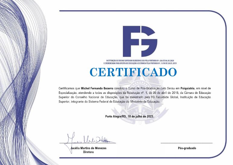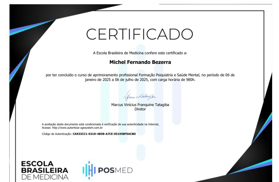 Quais são as principais especialidades de Michel Fernando Bezerra?Michel Fernando Bezerra é generalista, psiquiatra. Te mostramos alguns dos serviços oferecidos pelo especialista graças à sua trajetória e vasta experiência: Teleconsulta.