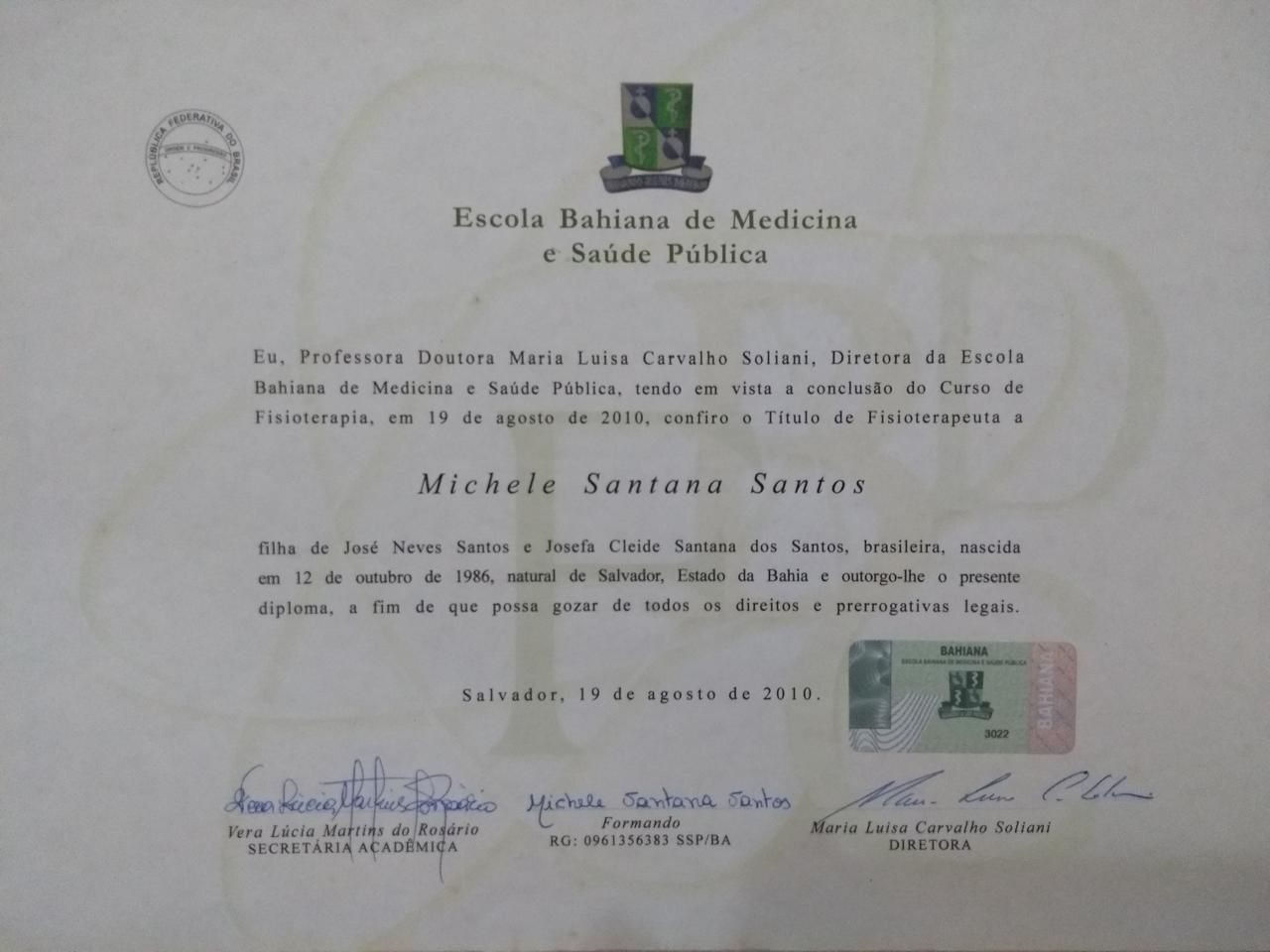 Fisioterapeuta graduada pela Escola Bahiana de Medicina e Saúde Pública (EBMSP), 2010.