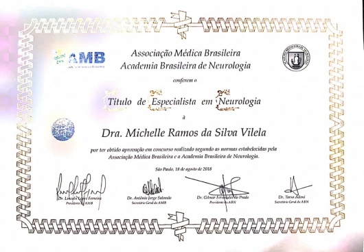 Drª Michelle Ramos da Silva Vilela, graduada em Medicina pela Universidade Estadual de Montes Claros em 2012, Residência Médica em Neurologia pelo Hospital Madre Teresa entre 2015 e 2017, Membro Titular da Academia Brasileira em Neurologia desde 2018, com Capacitação em Distúrbios de movimento com ênfase em DBS – Santa Casa de Belo Horizonte de 2019 à 2021.